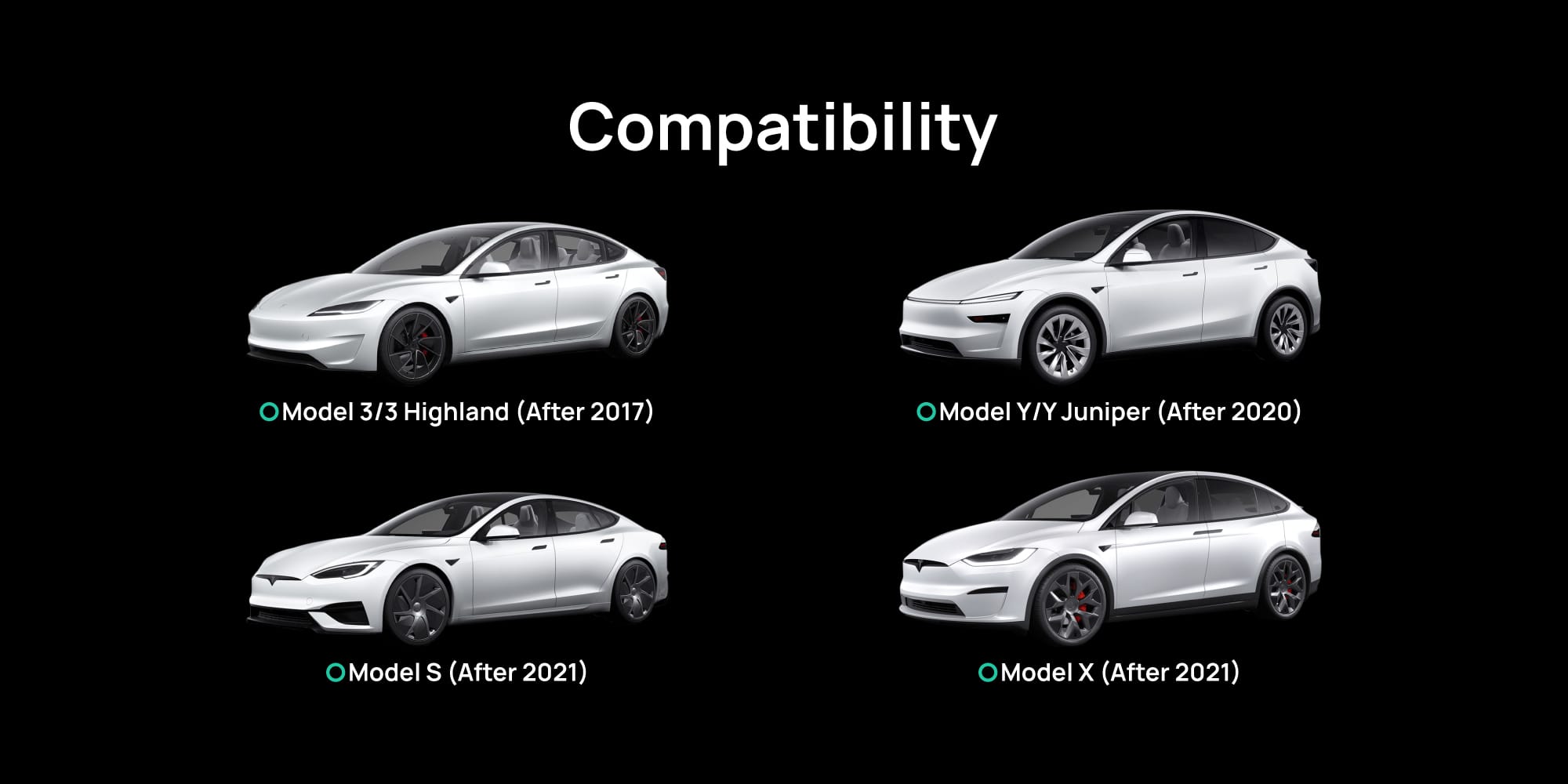 Compatible with Tesla Model 3 (2017+), Model 3 Highland, Model Y (2020+), Model Y Juniper, and Model S / Model X (2021+).