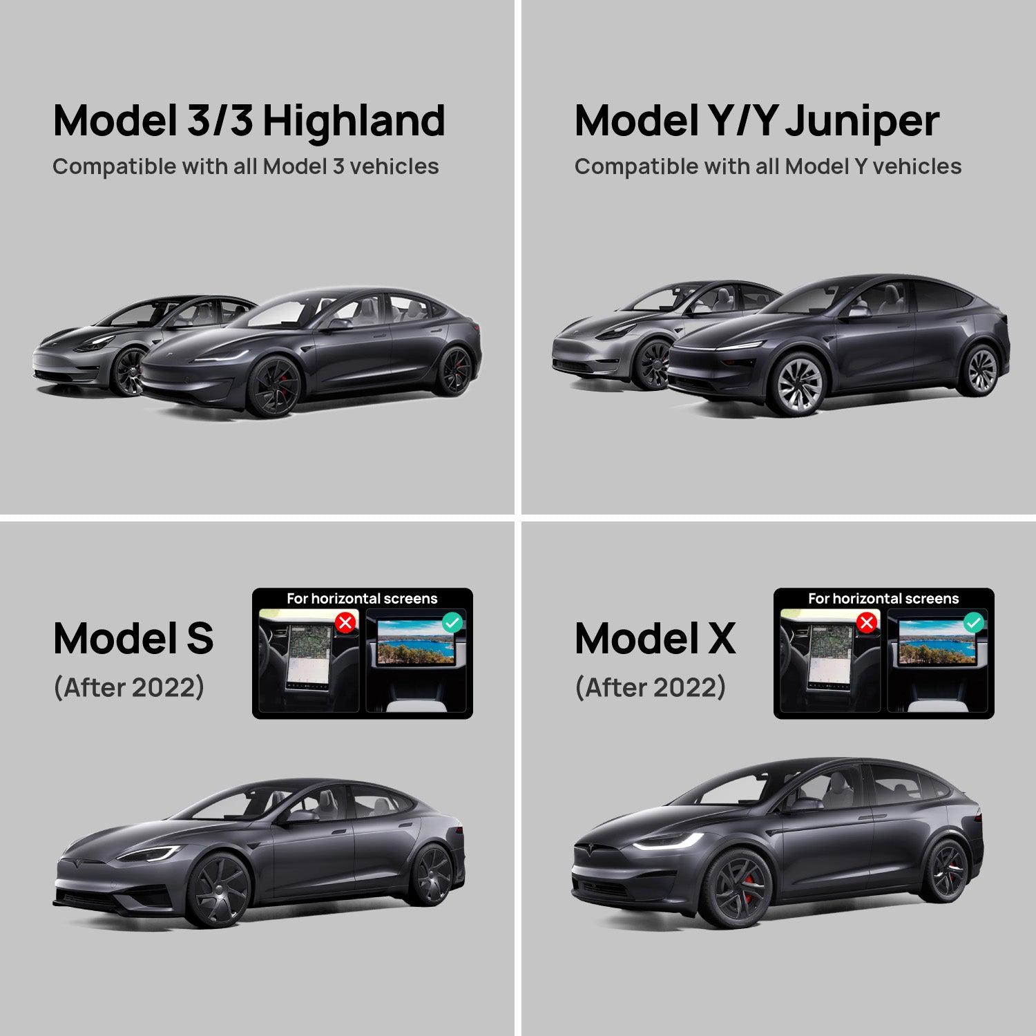 Compatible with Tesla Model 3 (2017+), Model 3 Highland, Model Y (2020+), Model Y Juniper, and Model S / Model X (2021+).