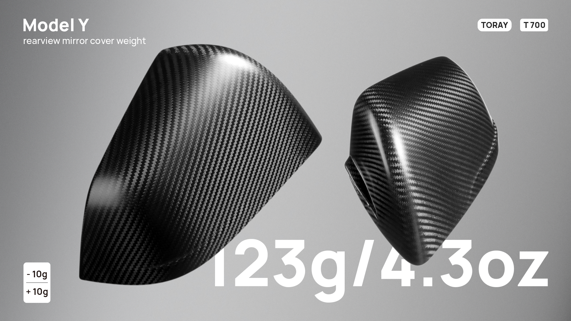 Upgrade your Tesla Model Y with these high-quality, lightweight rearview mirror covers, precision-crafted from TORAY T700 carbon fiber. Weighing just 123g (4.3oz), they provide a sleek and durable enhancement to your vehicle, offering both style and functionality. The weight tolerance of ±10g ensures a perfect fit and finish, making these covers an ideal addition to your Tesla's aesthetics.