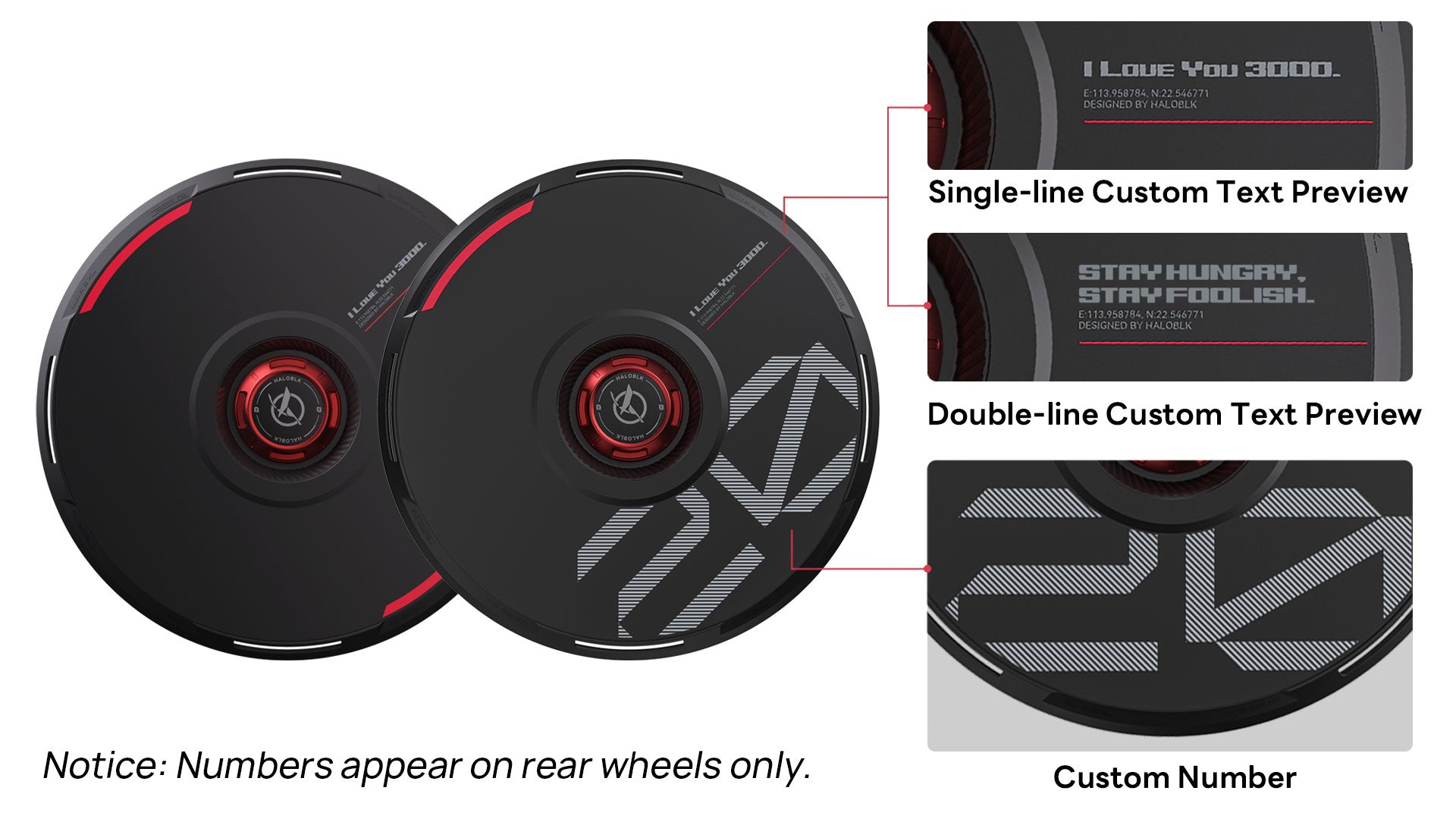 HALODISC 2 | Custom Numbers Wheel Covers (Black) + Alloy Pedals 2 for Tesla