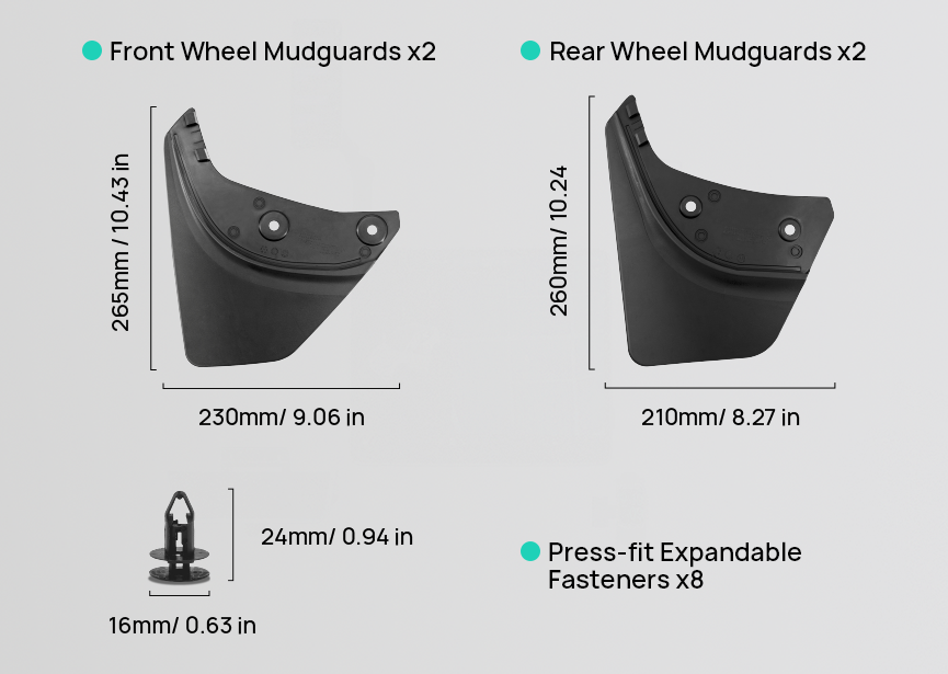 Combining tough PP and resilient TPV materials, these mudguards ensure a secure fit and resistance to scrapes and bends in all road conditions.